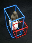 2013Modelstudie in zwart keramiek waaraan een begrenzing (IN) in de vorm van een opengewerkte blauwe kubus is toegevoegd die het geijkte kader symboliseert. Een tweede opengewerkte kubus in rood wordt door de mannenfiguur naar buiten (OUT) geduwd en symboliseert de – deels succesvolle poging – om buiten dit kader te treden. Door de verwevenheid van de kubussen wordt de spanning tussen binnen en buiten nog meer naar voren gebracht. De benen van de figuur verdwijnen deels in een derde kubus in de niet-kleur wit, als ware het een symbolisch blok aan het been.