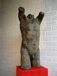 2012Academische studie naar model, uitgevoerd in aluminiumcement. Nek en armen zijn ruw “afgebroken”. Het werk heeft een ruwe oppervlaktestructuur, maar de huid is op veel plaatsen bedekt met een ietwat glad, bruinachtig patine, waardoor het geheel wordt verlevendigd. Het fel rood van de houten sokkel (50 cm hoog) zuigt met zijn contrastkleur de aandacht naar de daarop geplaatste neutraal gekleurde torso.