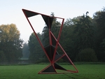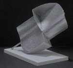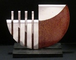 2011Ontwerp op schaal voor een plastiek, bedoelt om uiteindelijk vorm te worden gegeven in Cortenstaal in combinatie met geborsteld RVS. In dit ontwerp is gebruik gemaakt van geometrische parallelle doorsnijdingen van een cirkelvlak, die vervolgens rond zijn gezet, waardoor een speelse vorm ontstaat met zowel rechte en vloeiende lijnen. Het ontwerp is echter ook geschikt voor uitvoering op een nog kleinere schaal als sierraad. Hierbij valt dan te denken aan uitvoering in tweekleurig edelmetaal of titanium. Prijsindicatie voor uitvoering in 10 mm Cortenstaal (82 x 62 x 10 cm) € 1300