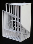 2011Bijna architecturaal vormgegeven (schaalmodel) dat ondanks (of juist door) de zowel symmetrisch als asymmetrisch geordende lijnen een tot hallucinatie neigende wanorde teweeg brengt. Kenmerkend bij dit werk is dat alle lijnen exact passen in de uitsnijdingen in de zijvlakken van de omsluitende rechthoek. Hoewel het een losstaand driedimensionaal object betreft, zijn variaties denkbaar en uitvoerbaar, waarbij de omsluitende rechthoek wordt gevormd door muren, plafond en vloer van een ruimte; waarin de uitsparingen als een muurschildering worden aangebracht en de uit de omsluitende vlakken “gesneden” rechte en cirkelvormige stroken de “omgeving” binnendringen. Door op de achterwand (niet aanwezig in dit schaalmodel) een vlakke spiegel aan te brengen, zal het hallucinerende effect worden verdubbeld. Op de foto is een wit model afgebeeld tegen een zwarte achtergrond, maar andere contrasterende kleuren behoren tot de mogelijkheden.