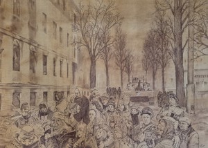 2022Oekrainers op de vlucht uit hun verwoeste stad. Gebaseerd op een groot aantal niewsfoto's die ik als een soort collage heb samengevoegd tot één beeld. Uitgevoerd op Steinbach papier dat met bister is behandeld alvorens de tekening in Conte-potlood is aangebracht.